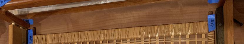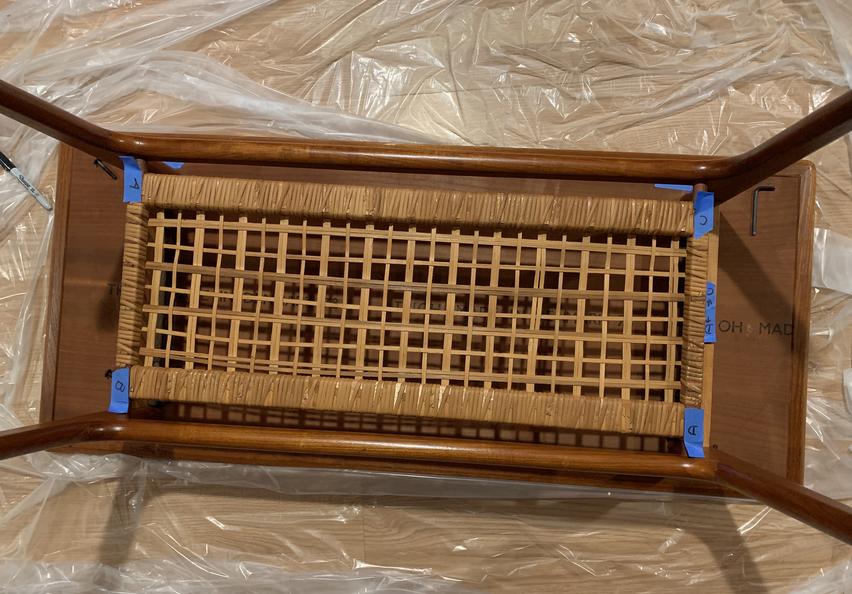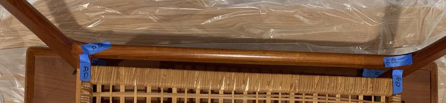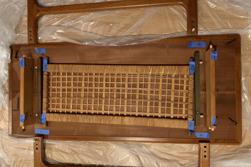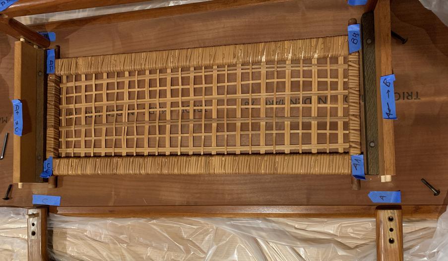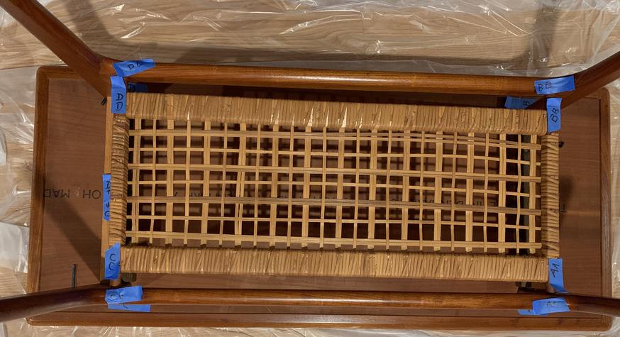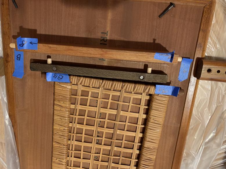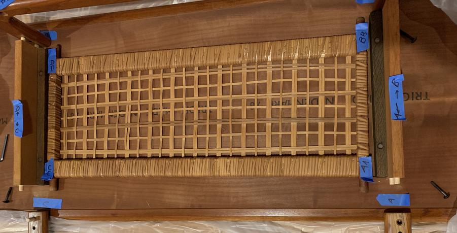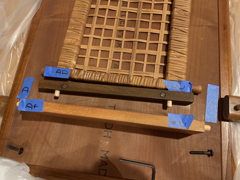 NOW carefully pushing the leg frame with one side of the caned shelf attached into place