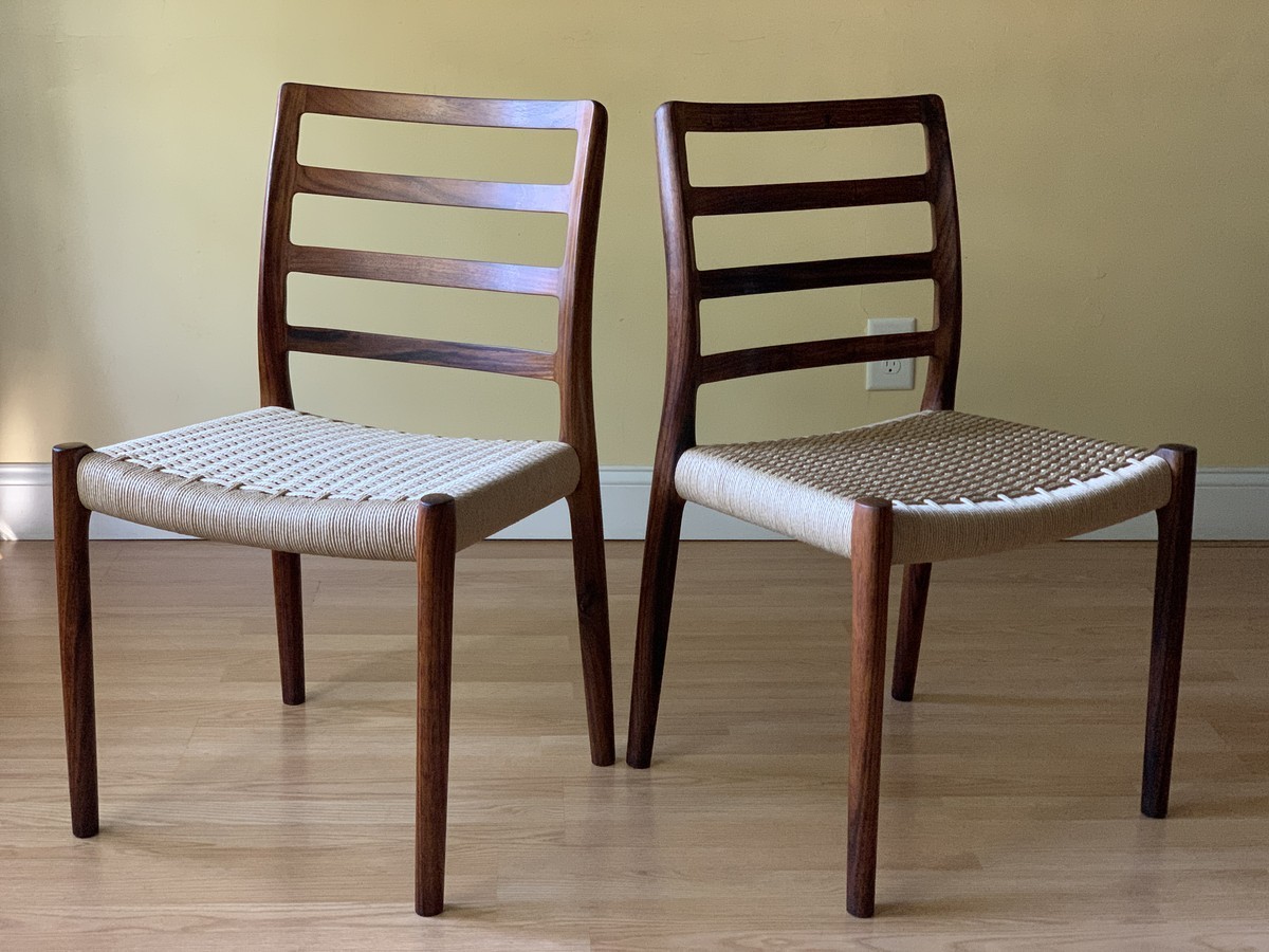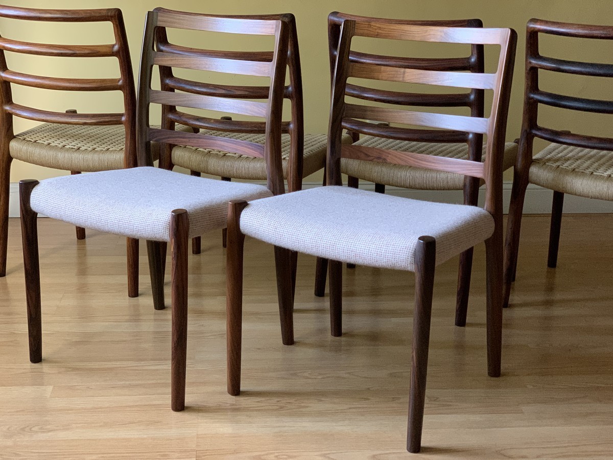 An incredible set of six Model No. 85 rosewood dining chairs. Four restored chairs with newly woven Danish paper cord; two in original like-new condition in original wool fabric. The rosewood has naturally aged without oiling — stunning grains.